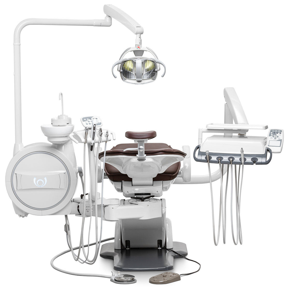 Главная особенность модели — система «Перформер», позволяющая переключать конфигурацию для врачей правши и левши без потери функциональности. Это решение делает установку по-настоящему универсальной. Чугунное основание и каркас кресла из алюминиевого сплава обеспечивают исключительную устойчивость.